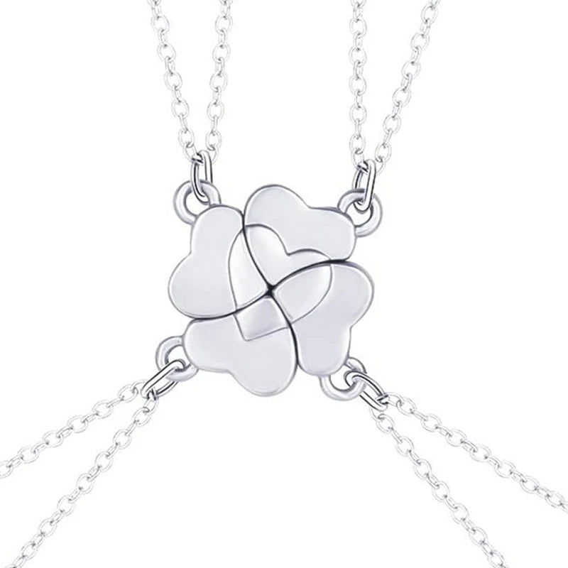 Confectionné en métal résistant, Clova est disponible en version argentée ou dorée pour s’adapter à tous les styles. Chaque chaîne mesure 45 cm, avec une extension de 5 cm pour plus de confort. Le pendentif complet mesure 22 x 22 mm, et chaque cœur se détache facilement pour créer quatre colliers individuels.