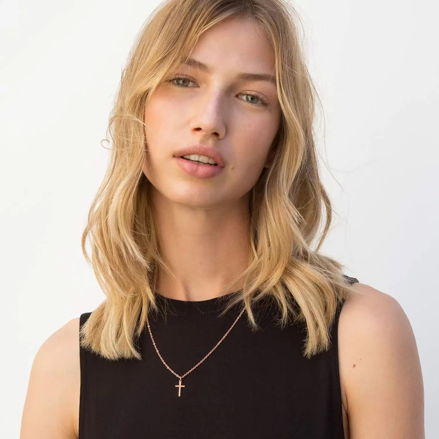 Le pendentif en croix, aux lignes fines et discrètes, évoque la sobriété tout en apportant une dimension spirituelle subtile. Sa teinte rose gold, douce et moderne, en fait un accessoire raffiné qui attire le regard sans jamais en faire trop.