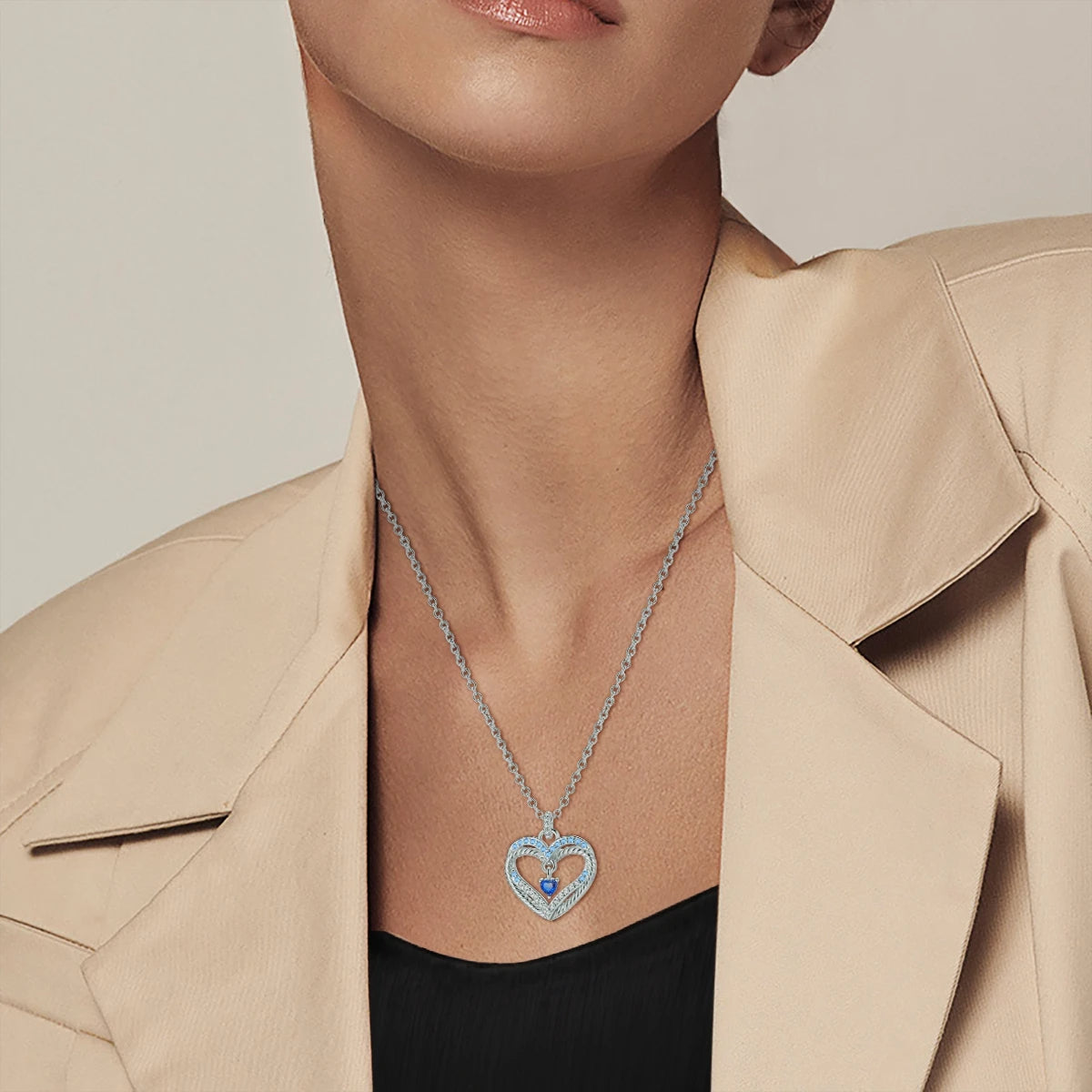 Ce collier délicat est fabriqué en argent sterling 925 et orné de pierres cubiques zircon bleues finement serties dans un double cœur ajouré. Le pendentif, mesurant 16,4 mm de haut pour 16,9 mm de large, est suspendu à une chaîne de 45 cm qui épouse parfaitement le cou.